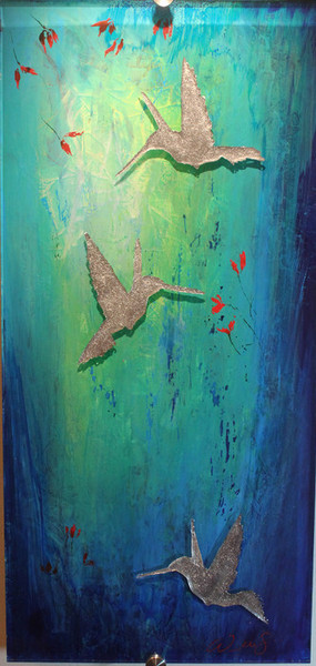 Contemporary Acrylic Artwork back-painted with Silver Leaf raised Hummingbirds for your Home or Office.
